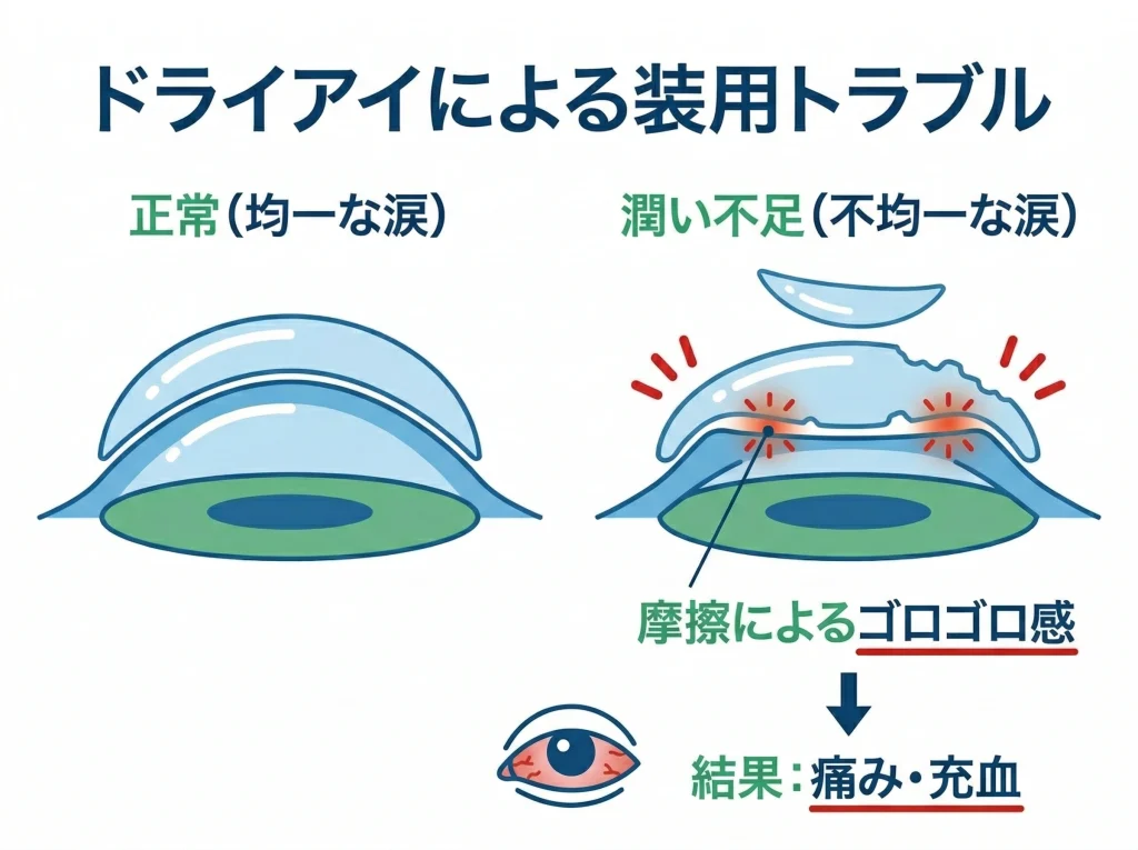 涙の量や質が落ちると、コンタクトが水分を奪いやすくなり、ゴロゴロ・しみる・痛いにつながります。