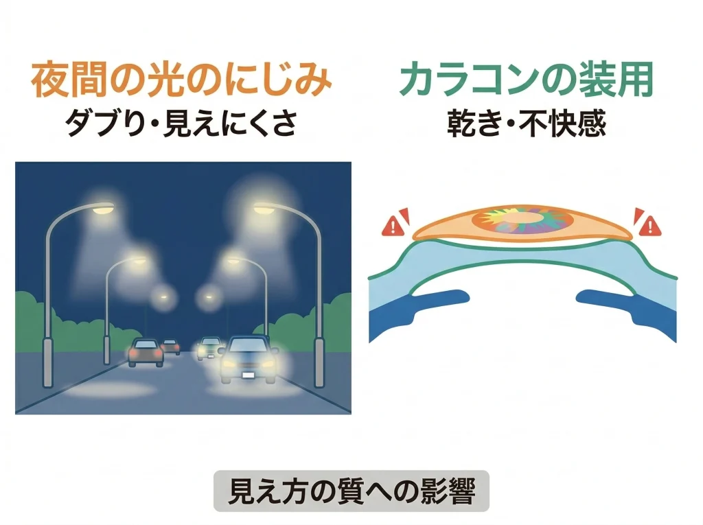 - ぼやける条件(夜間運転、PC作業、乾いたとき)